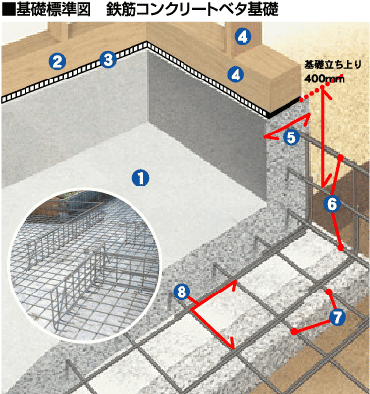●基礎と土台の間が換気口なので配筋などをキズつけず基礎は頑丈 ●基礎と土台が離れているので土台が腐らず乾燥状態を維持。 |