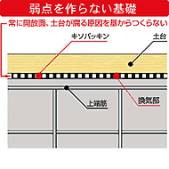 キソパッキング(ロング)工法は、床下換気を従来の基礎に風窓を開ける施工や、キソパッキン材を一定の間隔で配置する工法に比べ、基礎へ影響を与えず、換気面積も家の床下全体に均一にとれるため、住宅の施工精度や耐久性・構造安全性、省エネ効率など、家づくりには欠かせない住まいの品質を高めます。 |