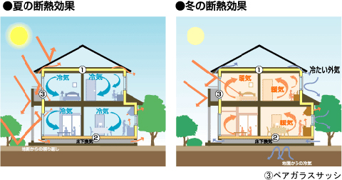 キソパッキング(ロング)工法は、床下の湿気を残らず排出することで床断熱材の乾燥状態をキープ。断熱効果を維持し、室内の温度を快適に保ちます。 ●住宅金融公庫/評価承認第1号 |